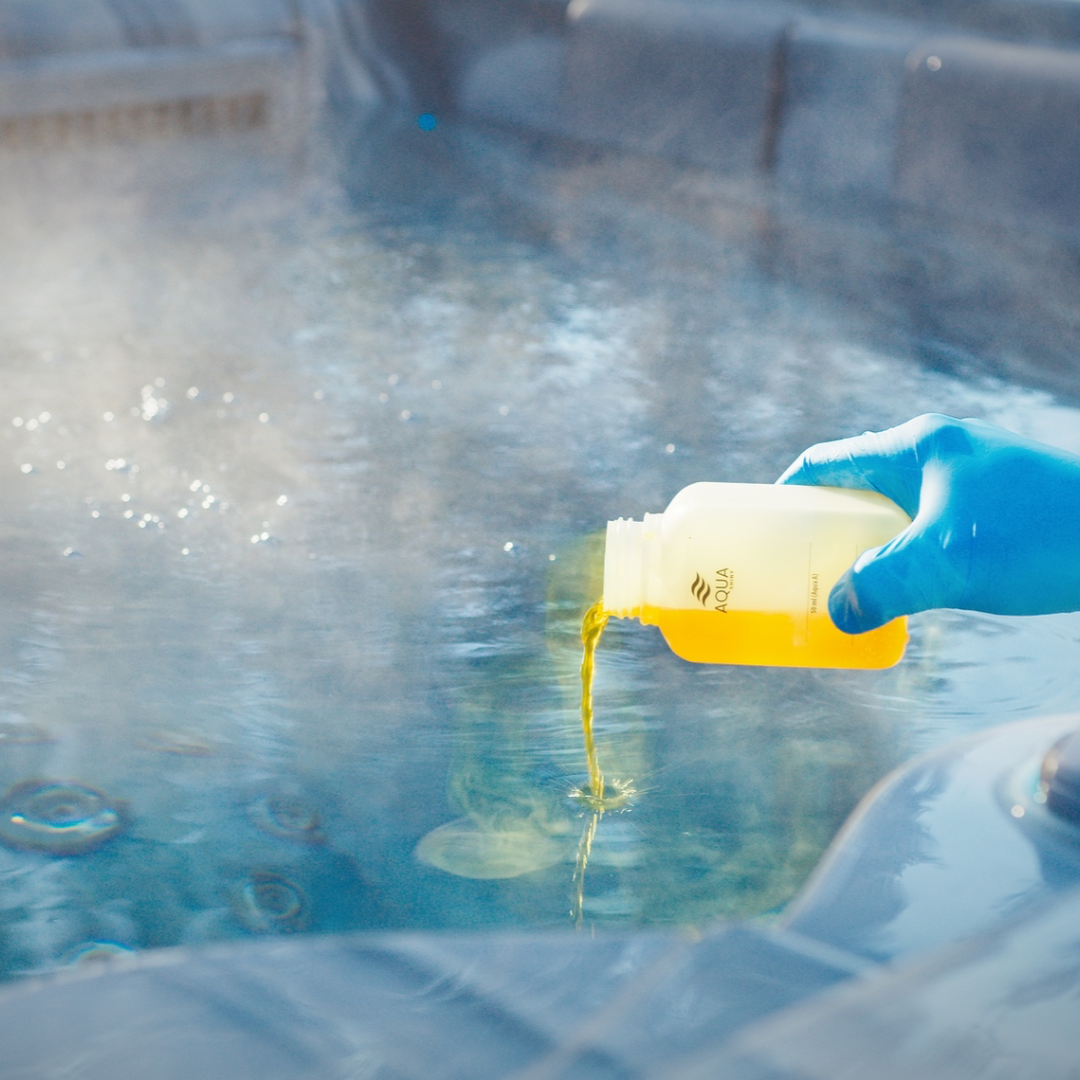 - Kun 5 minuuttia on kulunut, kaada puhdistusaine ulkoporealtaaseen tai paljuun ja käynnistä hierontapumput. Varmista, että aine sekoittuu veteen ja vesi muuttuu kellertäväksi!